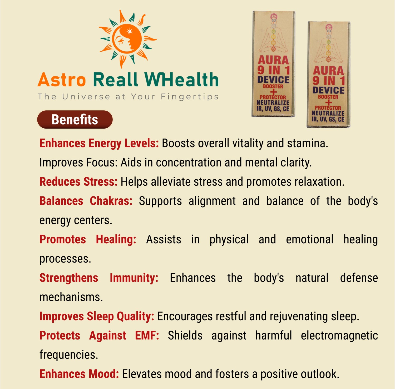 What is Aura 9 in 1 Device The Aura 9-in-1 Device is a multifunctional gadget designed to enhance overall well-being by leveraging various holistic and energy-based technologies. It combines nine distinct features to offer comprehensive benefits such as boosting energy levels, improving focus, reducing stress, balancing chakras, promoting healing, strengthening immunity, improving sleep quality, protecting against electromagnetic frequencies (EMF), and enhancing mood. This versatile device is intended to support physical, emotional, and mental health, creating a more balanced and harmonious life.