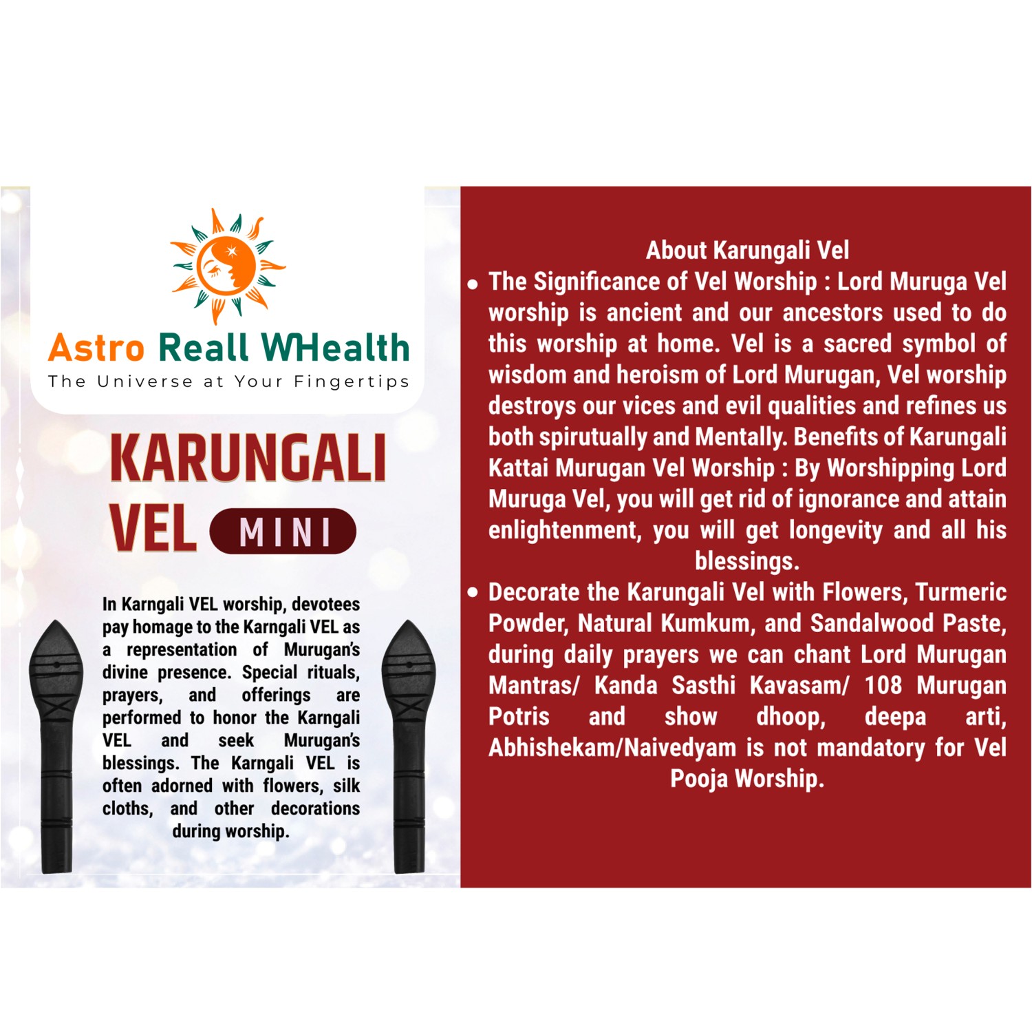 KARUNGALI VEL MINI In Karngali VEL worship, devotees pay homage to the Karngali VEL as a representation of Murugan’s divine presence. Special rituals, prayers, and offerings are performed to honor the Karngali VEL and seek Murugan’s blessings. The Karngali VEL is often adorned with flowers, silk cloths, and other decorations during worship.