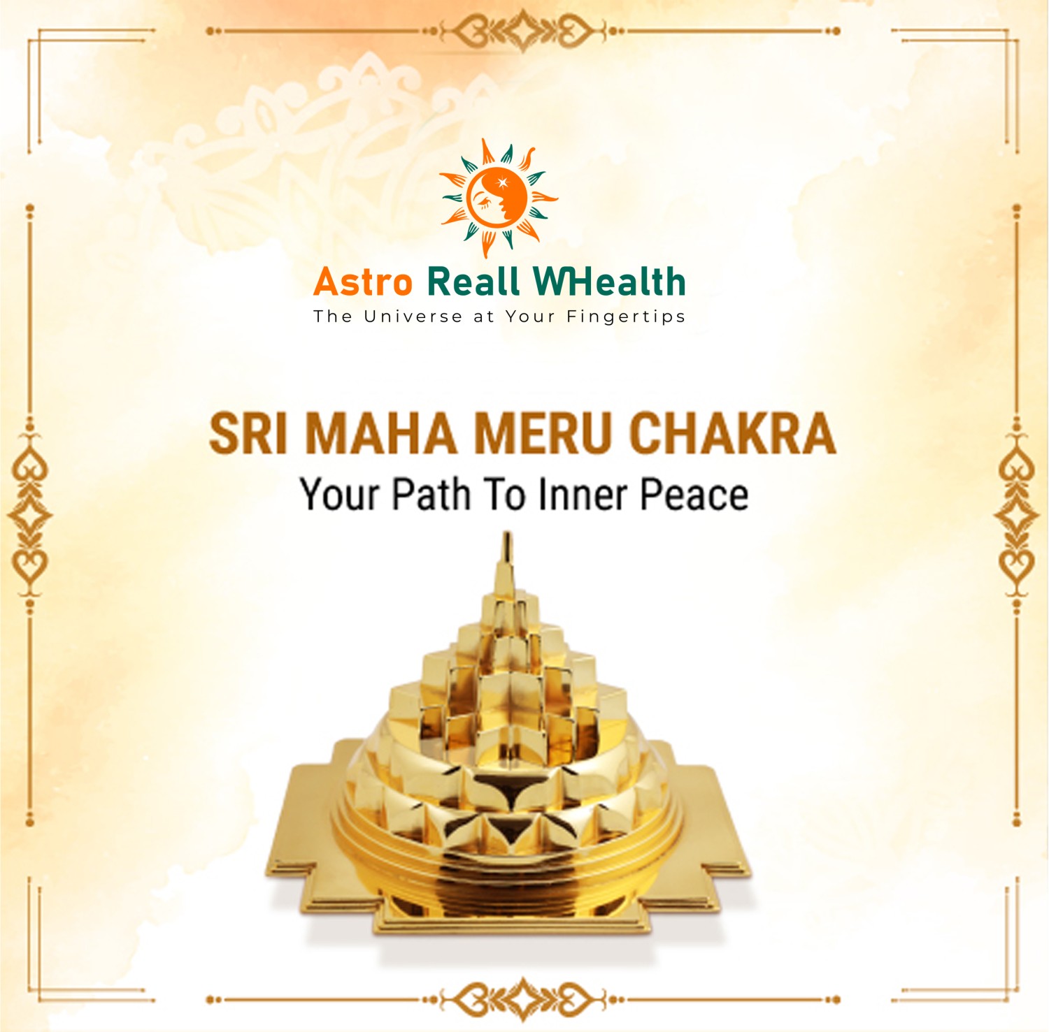 SRI MAHA MERU CHAKRA Your Path To Inner Peace Jain Astro presents the Sri Maha Meru Chakra, a sacred geometric symbol also known as the Shri Yantra. This powerful emblem in Hinduism represents divine feminine energy and the universe. It holds deep spiritual significance and is believed to offer numerous benefits to those who connect with it.