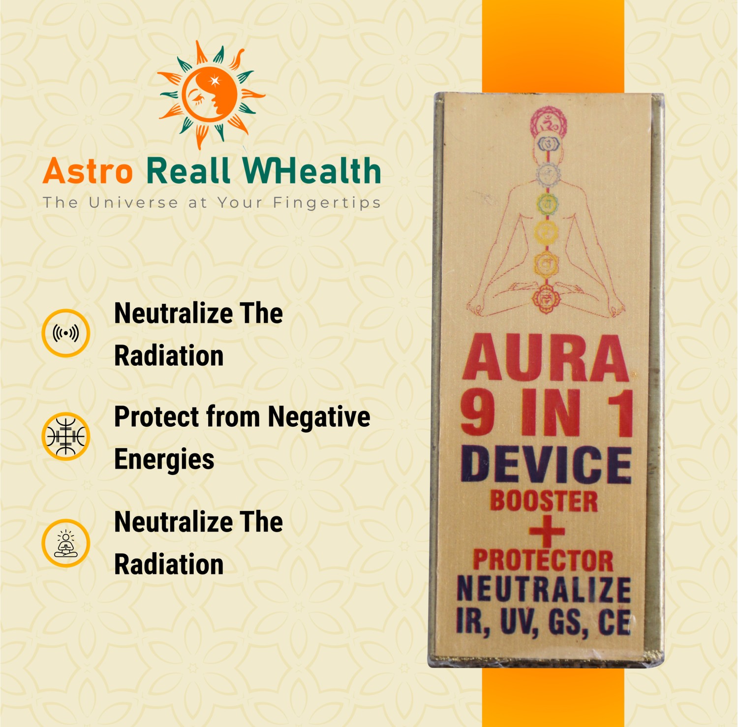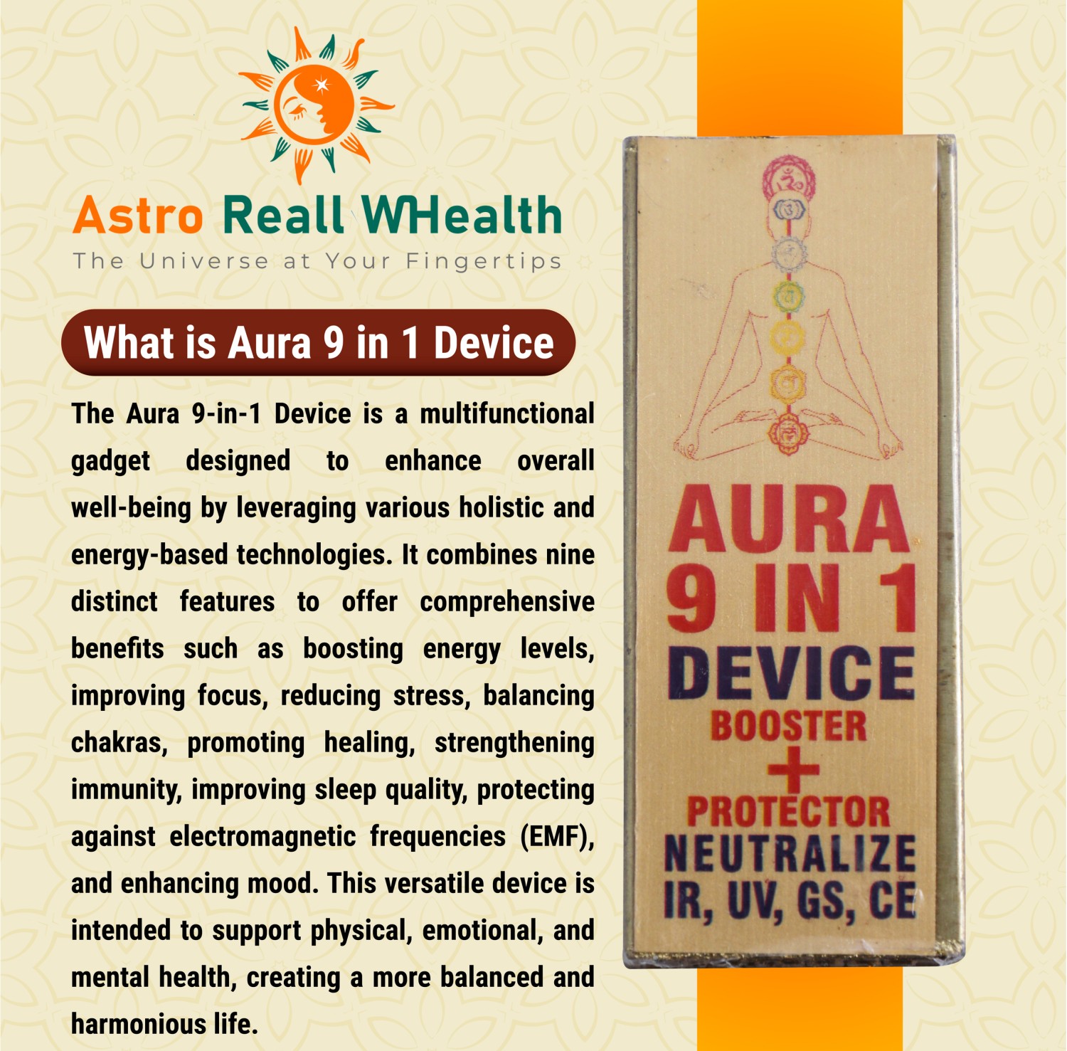 What is Aura 9 in 1 Device The Aura 9-in-1 Device is a multifunctional gadget designed to enhance overall well-being by leveraging various holistic and energy-based technologies. It combines nine distinct features to offer comprehensive benefits such as boosting energy levels, improving focus, reducing stress, balancing chakras, promoting healing, strengthening immunity, improving sleep quality, protecting against electromagnetic frequencies (EMF), and enhancing mood. This versatile device is intended to support physical, emotional, and mental health, creating a more balanced and harmonious life.