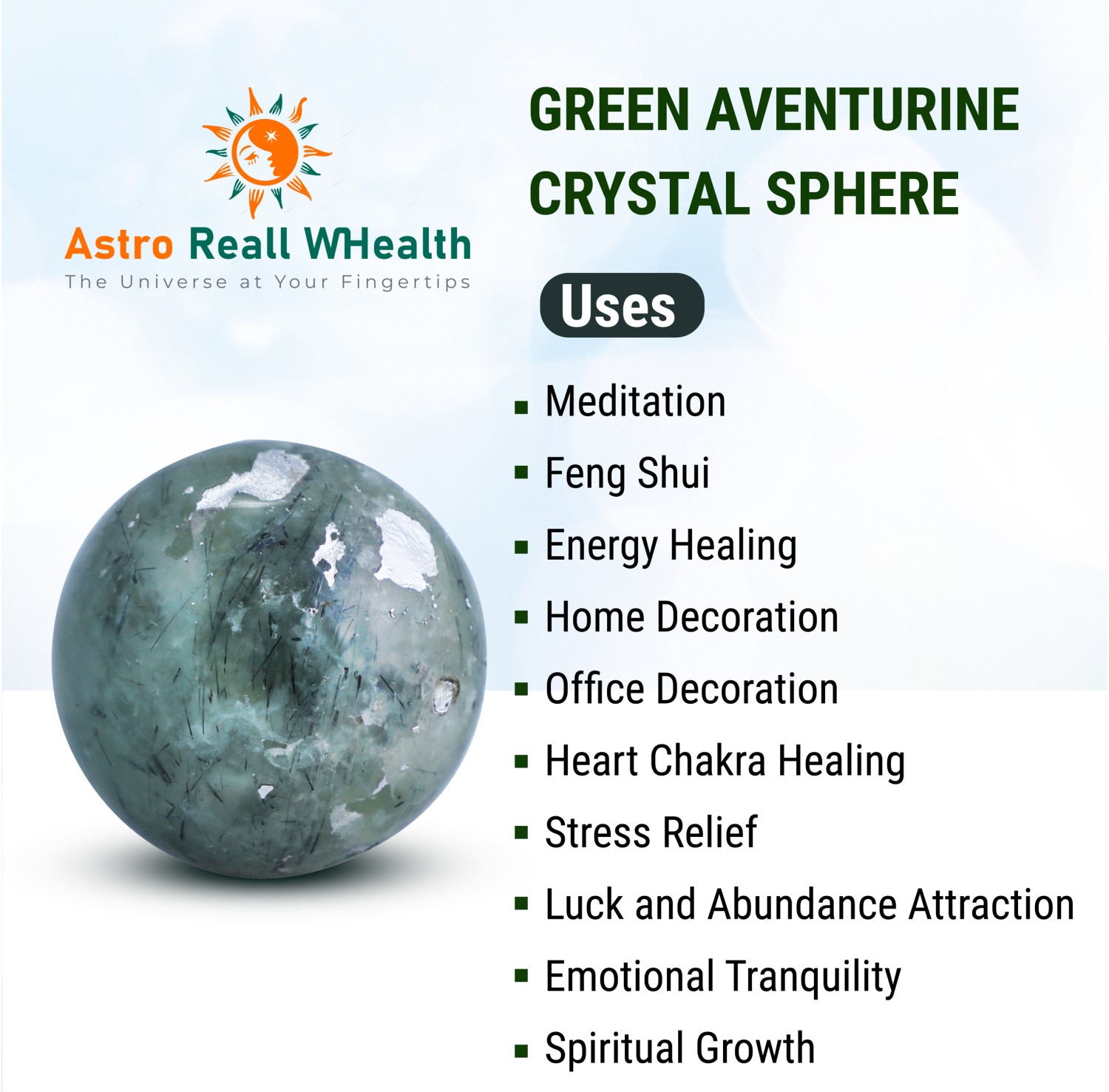 FEATURES Natural Gemstone: Made from authentic green aventurine, celebrated for its healing and calming effects. Smooth Polished Finish: Expertly polished to a smooth, glossy surface, enhancing its natural beauty and tactile appeal. Versatile Use: Perfect for meditation, feng shui, or as a decorative piece to elevate your home or office environment. Healing Properties: Known to attract luck, abundance, and positive energy, while promoting emotional tranquility and heart chakra healing. GREEN AVENTURINE CRYSTAL SPHERE.