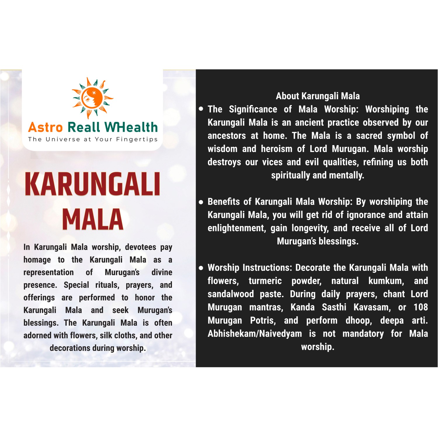 Karungali Mala Worship Method After receiving the Karungali Mala, first wash it once with raw milk, then wash it once with pure water. Allow it to dry well and then wipe it with a clean cloth. At an auspicious time, place the Mala in a heap of Vibuthi (Nattu Mattu Thiruneeru/Desi Cow Dung Bhasma) or raw rice in a brass or copper pot/plate in the Pooja Room. Arrange the Mala in a suitable position for worship.