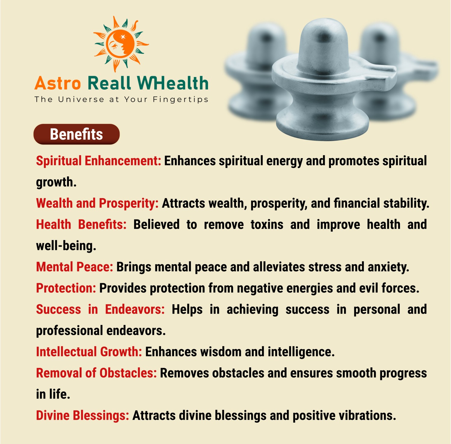 Benefits Spiritual Enhancement: Enhances spiritual energy and promotes spiritual growth. Wealth and Prosperity: Attracts wealth, prosperity, and financial stability. Health Benefits: Believed to remove toxins and improve health and well-being. Mental Peace: Brings mental peace and alleviates stress and anxiety. Protection: Provides protection from negative energies and evil forces. Success in Endeavors: Helps in achieving success in personal and professional endeavors. Intellectual Growth: Enhances wisdom and intelligence. Removal of Obstacles: Removes obstacles and ensures smooth progress in life. Divine Blessings: Attracts divine blessings and positive vibrations.