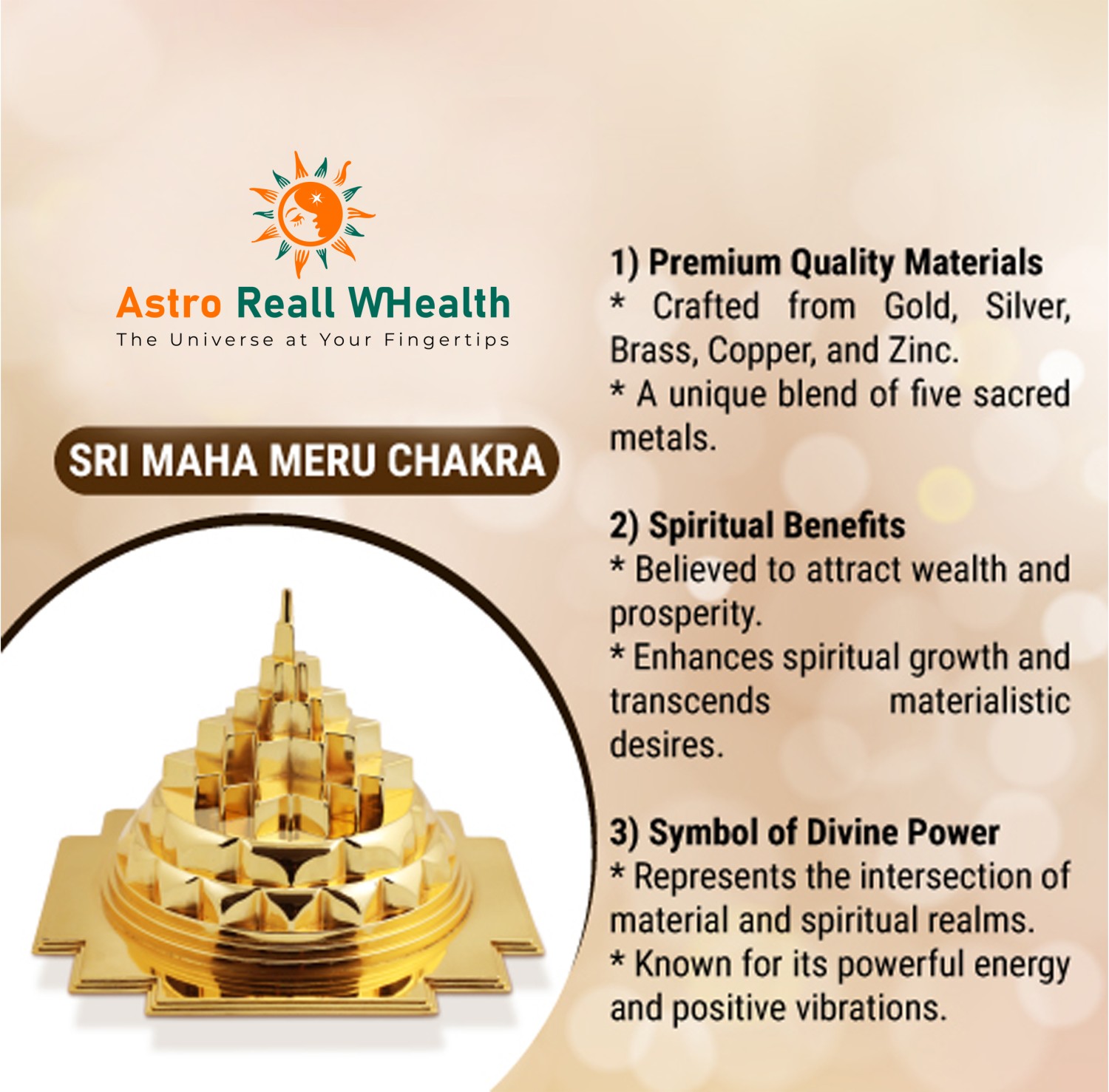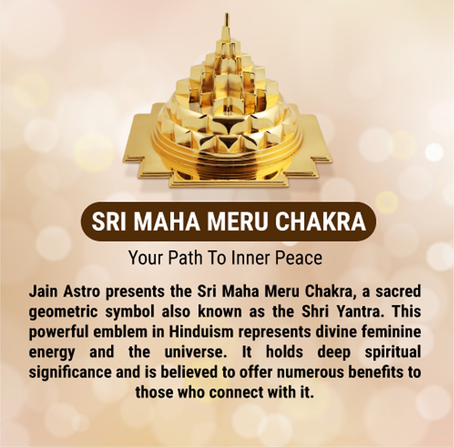 SRI MAHA MERU CHAKRA Your Path To Inner Peace Jain Astro presents the Sri Maha Meru Chakra, a sacred geometric symbol also known as the Shri Yantra. This powerful emblem in Hinduism represents divine feminine energy and the universe. It holds deep spiritual significance and is believed to offer numerous benefits to those who connect with it.