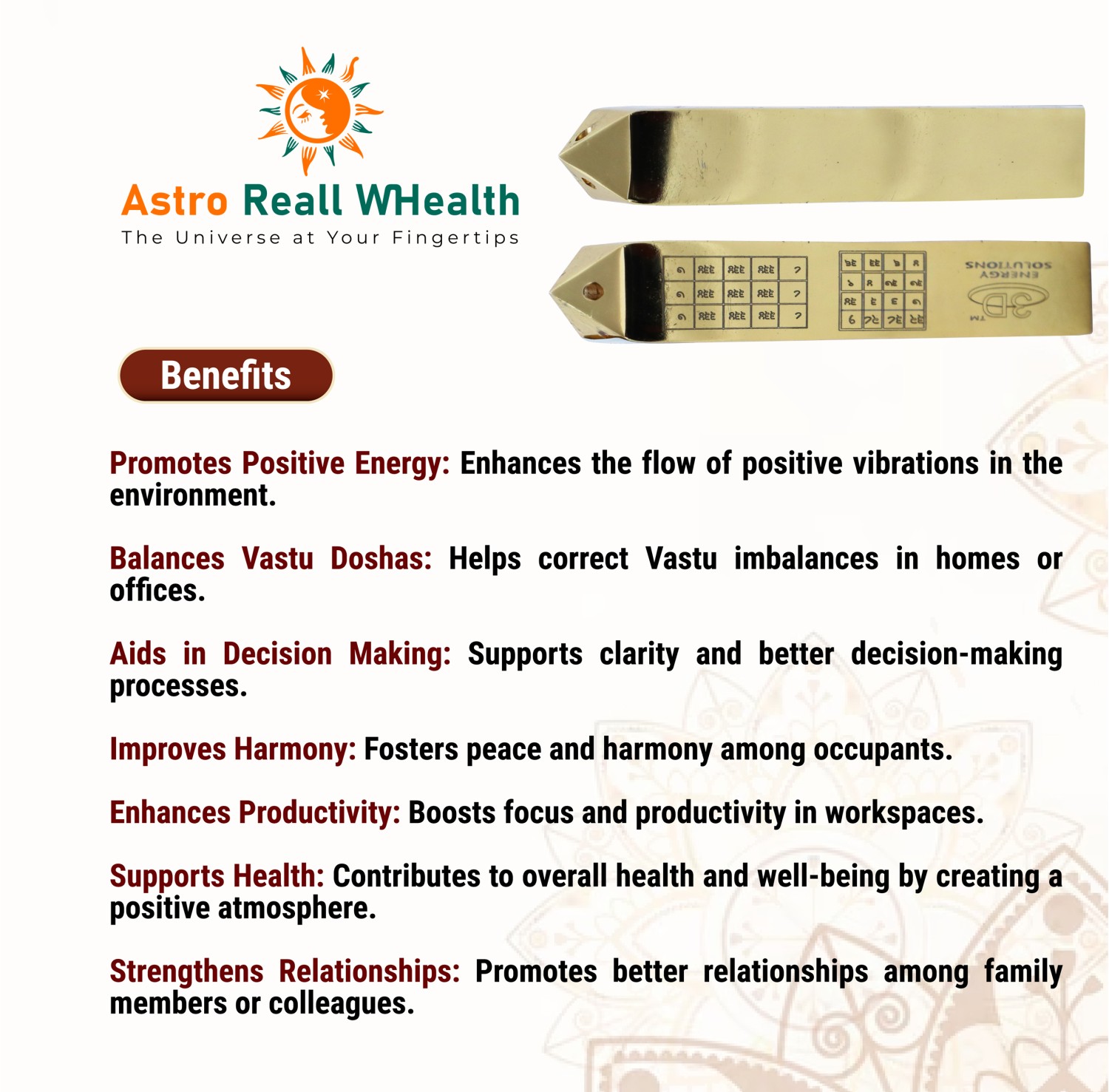 Benefits Promotes Positive Energy: Enhances the flow of positive vibrations in the environment. Balances Vastu Doshas: Helps correct Vastu imbalances in homes or offices. Aids in Decision Making: Supports clarity and better decision-making processes. Improves Harmony: Fosters peace and harmony among occupants. Enhances Productivity: Boosts focus and productivity in workspaces. Supports Health: Contributes to overall health and well-being by creating a positive atmosphere. Strengthens Relationships: Promotes better relationships among family members or colleagues.